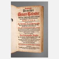 auf das Jahr nach unsers Herrn und Seligmachers Jesu Christi Geburt MDCCXLI, worinnen enthalten Der Verbesserte, der neue Gregorianische, Alte Julianische und Schwedische, Jüdische, Römische und ein Schreib-Calender, ..., deme noch beygefügt Das Genealogische Register der itzt-lebenden Durchlauchtigsten Höchst- und hohen Häuser des Welt-Krayses, Format Kl. 8°, 164 S., Pergamenteinband der Zeit, Bibliotheksstempel ”Archiv der Familie Albers”, altersentsprechend guter Zustand.