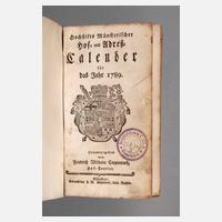 für das Jahr 1789, herausgegeben von Friedrich Wilhelm Coppenrath, Format Kl. 8°, 222 S. und 41 Blatt, enthält ”Genealogisches Verzeichniß der vornehmsten jetzt lebenden hohen Personen in Europa“, Pappeinband, Bibliotheksstempel, normale Alters- und Gebrauchsspuren.
