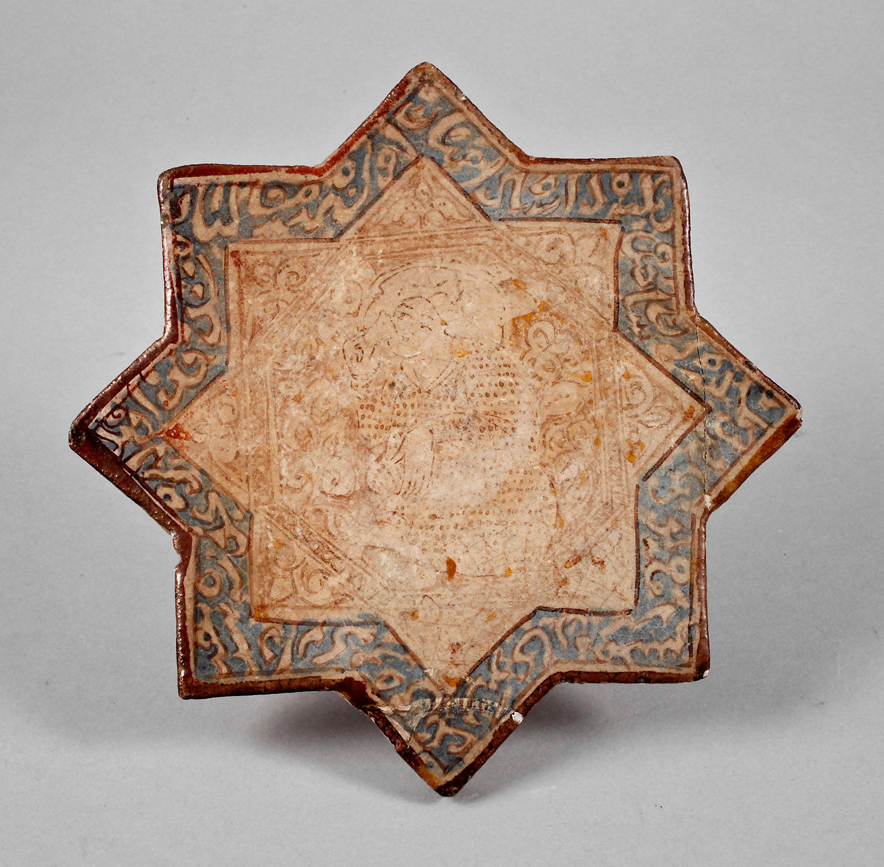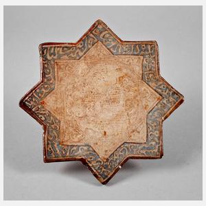 wohl ilkhanisch, 13. Jh., wohl Kashan/Iran, grauer Scherben, achtspitziger Stern, blassblauer Randbereich mit Schriftzeichen, im Zentrum auf beigem Grund gemalte Zeichnung eines sitzenden Mannes, welcher einen Trinkbecher zum Mund führt, glasiert, Altersspuren, leicht restauriert (geringfügig geklebt sowie ein Haarriss), D ca. 21,5 cm, Stärke ca. 1,5 cm.