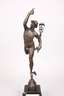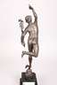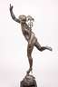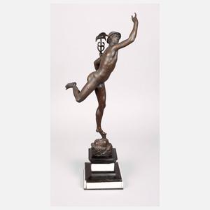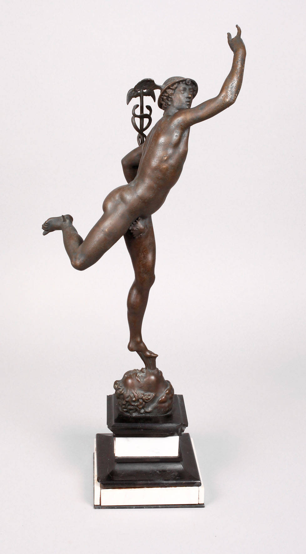 unsigniert, Gießerstempel: ”F. Barbedienne. Fondeur.”, weiterer Stempel ”Reduction mécanique A. Collas Brevete”, Bronze dunkel patiniert, Darstellung nach dem Giambologna genannten flämisch-italienischen Bildhauer, der Florentiner Schule des Manierismus und Frühbarock, Darstellung des Merkur mit Äskulapstab, sinnbildlich auf dem Antlitz des Nordwinds reitend, auf quadratischem Sockel aus hellem und dunklem Marmor, Oberfläche mit Ätzspuren, teils stärker bestoßen, mit fehlenden kleinen Flügelchen und gebrochenem Äskulapstab, H Bronze ca. 54 cm, H gesamt ca. 65 cm.