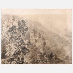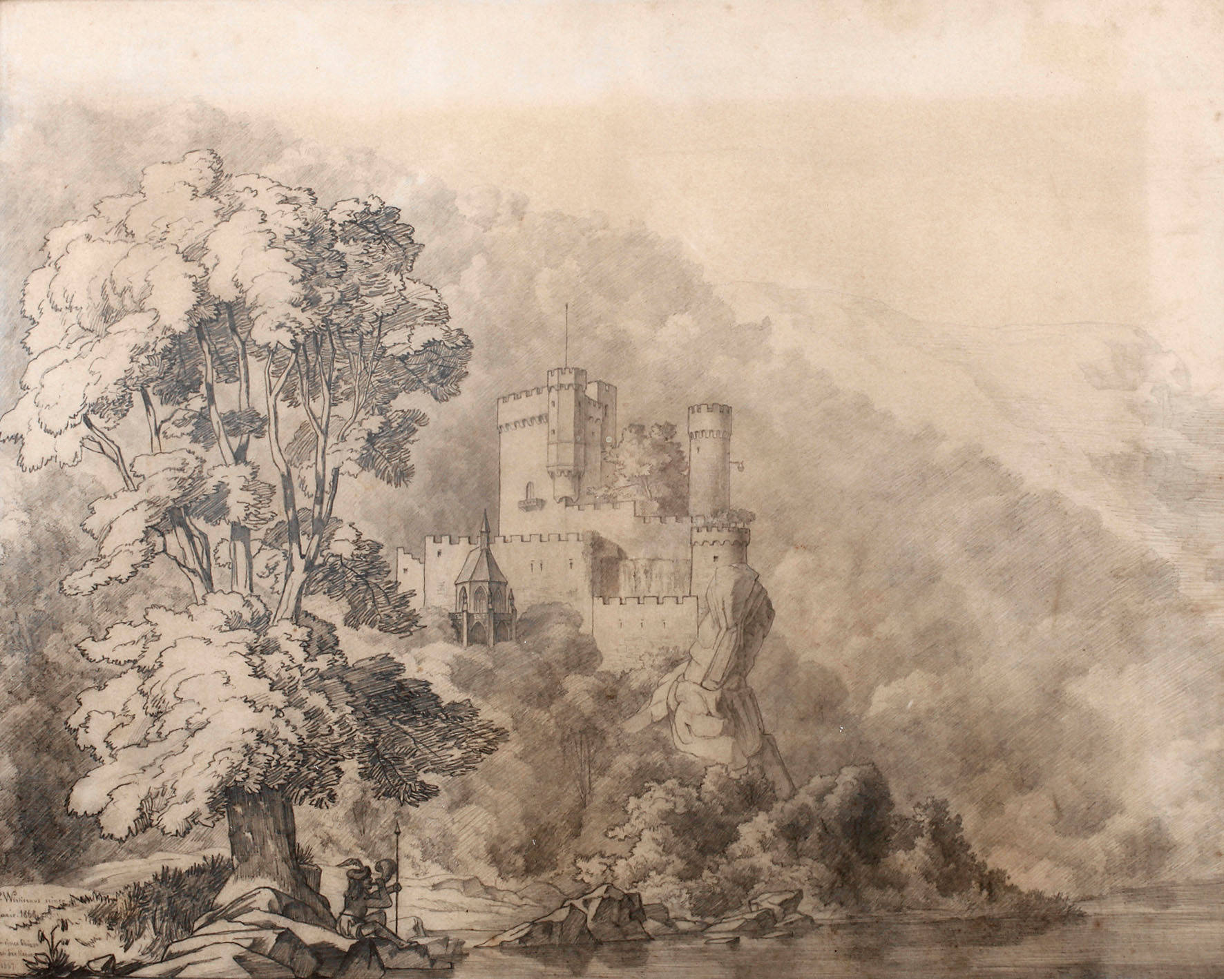 Blick vom baumbestanden Ufer des Rheins auf die mittelalterliche Spornburg zwischen Bingen und Trechtingshausen, die märchenhaft anmutende Szene wird komplettiert durch einem am Flussufer sitzenden und auf seinem Horn blasenden Herold, Bleistiftzeichnung, links unten signiert, datiert und dediziert ”P. Wislicenus seiner Marie 1868 von einer Skizze nach der Natur 1867”, die Zeichnung entstand im Jahre der Promotion des Zeichners über ”Geschichte der Elbgermanen vor der Völkerwanderung”, der ein Aufenthalt am Rhein vorausgegangen war - so ist es durchaus nicht verwunderlich, dass Wislicenus seiner naturalistisch festgehaltenen Landschaft, ganz in spätromantischer Tradition, eine historisierende Figur hinzufügte, Wislicenus widmete das Blatt seiner künftigen Ehefrau Marie Auguste Stückrath, welche er im Jahre 1870 heiratete, Blatt minimal fleckig und ungleichmäßig gegilbt, hinter Glas gerahmt, Falzmaße ca. 38 x 48 cm. Künstlerinfo: eigentlich Paul Gustav Wislicenus, dt. Historiker, Schriftsteller, Shakespeareforscher, Maler und Zeichner (1847 Halle/Saale bis 1917 Bad Nauheim), Cousin des Malers Hermann Wislicenus (1825-1899), 1853 Übersiedlung mit seinen Eltern nach Amerika, hier zunächst in Boston und ab 1854 in Hoboken bei New York lebend, 1956 Rückkehr über Paris nach Zürich, ab 1863 Geschichtsstudium an der Universität Zürich, 1868 Wechsel an die Universität Bonn und später nach Halle, 1869 schließlich Wechsel an die Universität Berlin, 1868 Promotion, künstlerisch Autodidakt, 1869-73 in Hamburg tätig, anschließend Lehrer an der Handelsschule Leipzig, ab 1875 für die ”Gesellschaft für Verbreitung von Volksbildung” in Berlin tätig, 1886-90 deren Generalsekretär, anschließend zeitweise Leiter des ”Alldeutschen Verbandes” und des Berliner Bismarck-Ausschusses, später wechselnde Aufenthalte, unter anderem in Berlin und in der Schweiz als Schriftsteller und Shakespeareforscher, Quelle: Wikipedia.