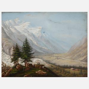 sommerlicher Blick von einer Anhöhe ins sonnige Tal der Arve, mit dem französischen Skiort der Les Grands Montets Chamonix-Mont-Blanc (auch Chamois) in der französischen Region Auvergne-Rhône-Alpes, Department Haute-Savoie, vor der Kulisse des imposanten schneebedeckten Mont-Blanc-Massivs, fein mit spitzem Pinsel kolorierte Mischtechnik (Gouache und Aquarell wohl über Litho), Mitte 19. Jh., unsigniert, freigestellt auf Karton, hier links unten teils vom Falz verdeckt betitelt ”Vue de Chamouni”, Altersspuren, original hinter Glas in ca. 3,5 cm breiter Berliner Leiste gerahmt, Bildmaße ca. 9 x 11,5 cm, Falzmaße Berliner Leiste ca. 21,5 x 26 cm.