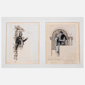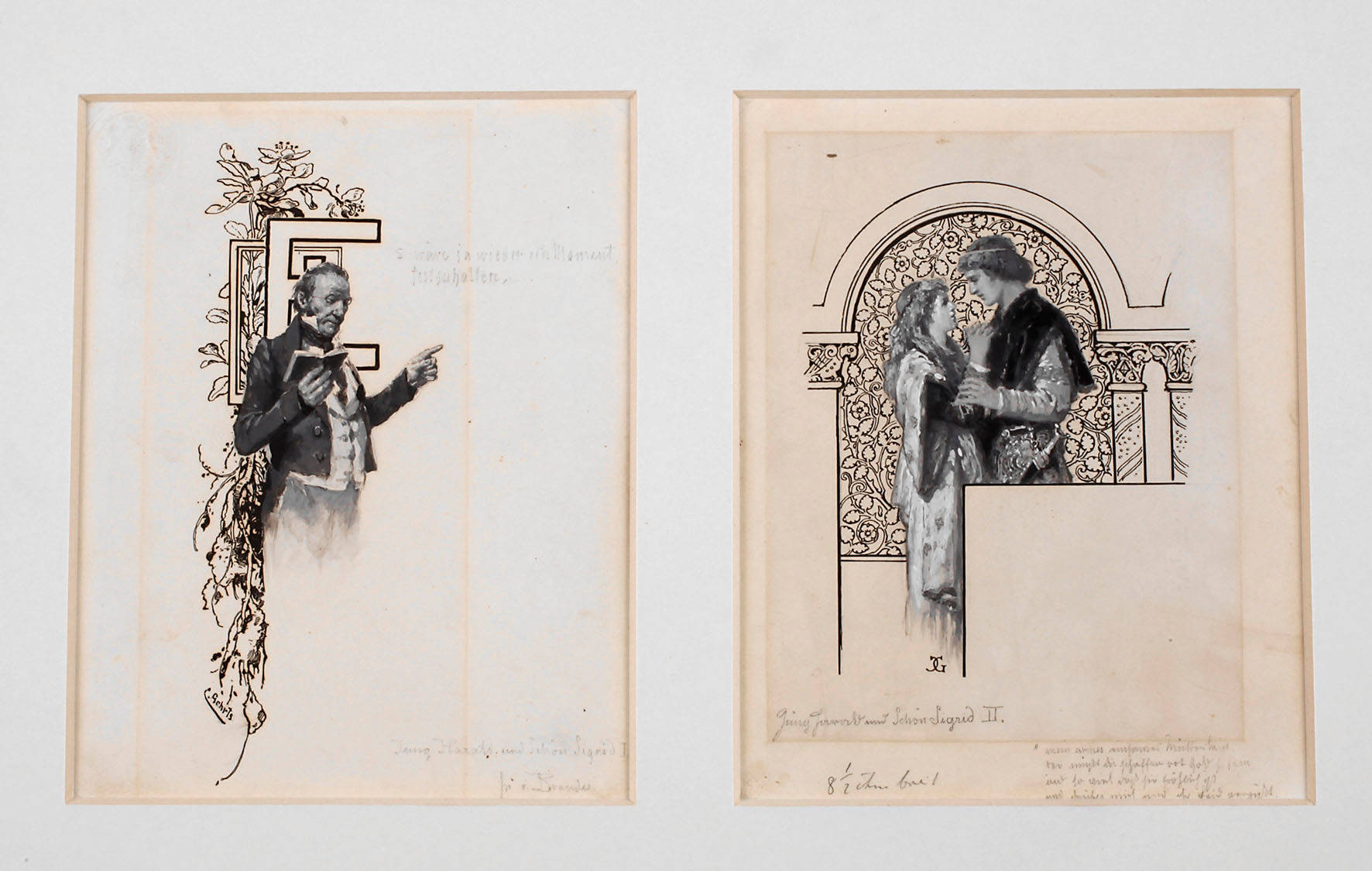 Initial ”E” mit dozierendem Professor, weiterhin Liebespaar unter romanischem Bogen, zwei Mischtechniken (Tuschezeichnungen und partiell Gouache in Grisailletechnik), einmal links unten signiert ”C. Gehrts” und einmal ligiert monogrammiert ”GC” sowie weitere originale handschriftliche Annotationen in Blei, Originalillustrationen der ”Fliegenden Blätter” von 1895 für das Poem ”Jung Harald und Schön Sigrid” veröffentlicht in Nummer 2626, Seite 22, Altersspuren, im gemeinsamen Passepartout und Folientasche, ungerahmt, Passepartoutausschnitt je ca. 19 x 15 cm, beigefügt Kopie der Illustrationen in den ”Fliegenden Blättern”. Künstlerinfo: eigentlich Karl Heinrich Julius Gehrts, dt. Historien-, Landschafts-, Portrait- und Genremaler, Zeichner, Kunstgewerbler, Gebrauchsgraphiker sowie Illustrator (1853 St. Pauli/Hamburg bis 1898 Bonn-Endenich), zunächst Abendschüler an der Gewerbeschule Hamburg bei Friedrich Heimerdinger, ab 1871 mit Stipendium Studium an der Großherzoglich-Sächsischen Kunstschule Weimar bei Ferdinand Brütt, Karl Gussow und Albert Baur, 1976 Wechsel mit Baur an die Akademie Düsseldorf, unterhielt freundschaftliche Kontakte zu Emil Zeiß, August Wittig, Heinrich Otto, Sophie Hasenclever, Mitarbeiter der Münchner Zeitschrift ”Fliegende Blätter” und der ”Gartenlaube”, tätig als Professor an der Akademie Düsseldorf, Mitglied im Düsseldorfer Künstlerverein ”Malkasten”, tätig in Düsseldorf-Rath, Quelle: Thieme-Becker, Boetticher und Wikipedia.