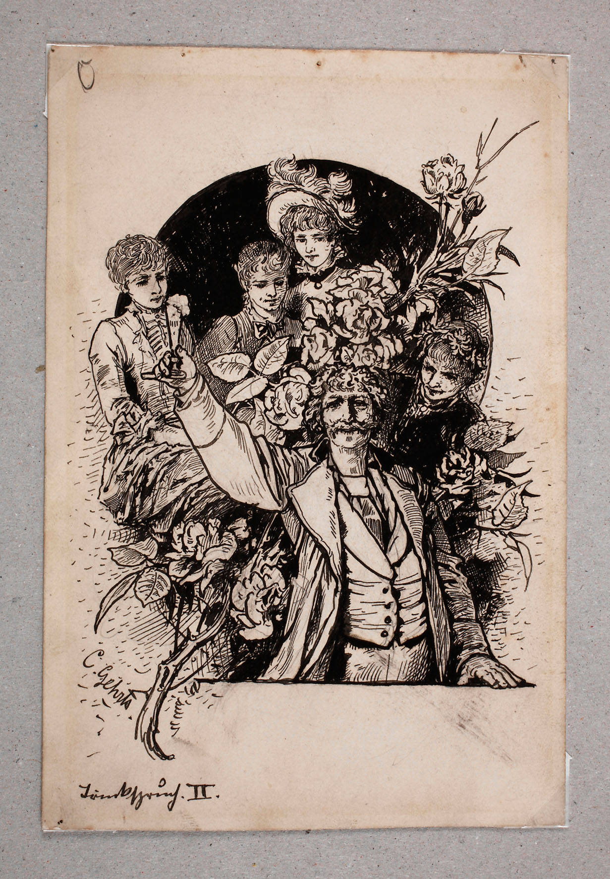 wohl Selbstbildnis des Künstlers mit erhobenem Glas in geselliger Runde, Tuschezeichnung, links unten signiert ”C. Gehrts” und betitelt ”Trinkspruch II.”, Originalillustration erschienen 1885 in den ”Fliegenden Blättern” (Nr. 2085, Seite 15), geringe Alters- und Atelierspuren, im Passepartout und Folientasche, ungerahmt, Passepartoutausschnitt ca. 16 x 10,5 cm, beigefügt Kopie der Illustration aus den ”Fliegenden Blättern”. Künstlerinfo: eigentlich Karl Heinrich Julius Gehrts, dt. Historien-, Landschafts-, Portrait- und Genremaler, Zeichner, Kunstgewerbler, Gebrauchsgraphiker sowie Illustrator (1853 St. Pauli/Hamburg bis 1898 Bonn-Endenich), zunächst Abendschüler an der Gewerbeschule Hamburg bei Friedrich Heimerdinger, ab 1871 mit Stipendium Studium an der Großherzoglich-Sächsischen Kunstschule Weimar bei Ferdinand Brütt, Karl Gussow und Albert Baur, 1976 Wechsel mit Baur an die Akademie Düsseldorf, unterhielt freundschaftliche Kontakte zu Emil Zeiß, August Wittig, Heinrich Otto, Sophie Hasenclever, Mitarbeiter der Münchner Zeitschrift ”Fliegende Blätter” und der ”Gartenlaube”, tätig als Professor an der Akademie Düsseldorf, Mitglied im Düsseldorfer Künstlerverein ”Malkasten”, tätig in Düsseldorf-Rath, Quelle: Thieme-Becker, Boetticher und Wikipedia.