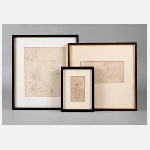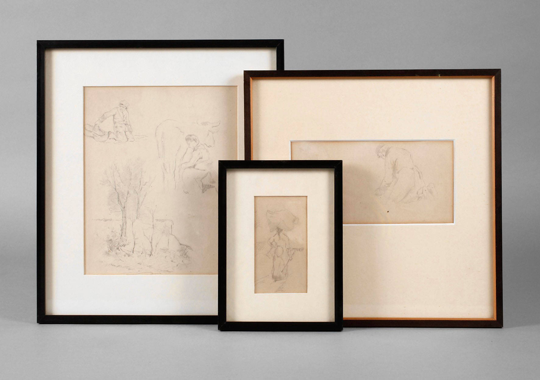 drei Blätter mit fünf Einzelstudien aus dem bäuerlich-ländlichen Milieu, Bleistift auf Papier, um 1900 unsigniert, wohl stets derselbe Künstler, Altersspuren, hinter Glas und Passepartout gerahmt, Passepartoutausschnitt max. ca. 22 x 18 cm.