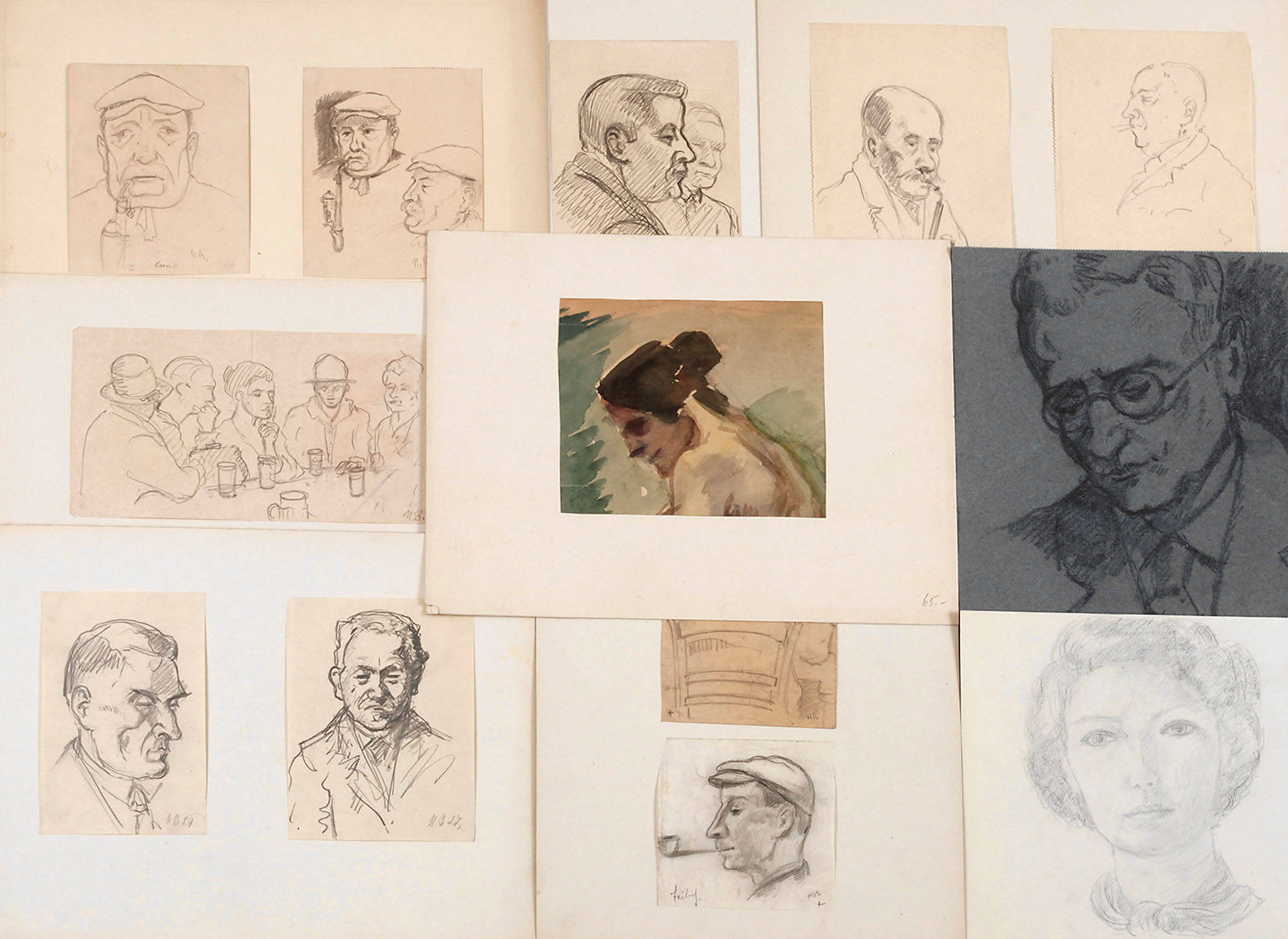bestehend aus 12 Bleistift- und Kohlezeichnungen, meist Portraitstudien und Genreszenen, dazu Kopfstudie eines Damenakts in Aquarell, teils zu mehreren auf Karton aufgeheftet, unterschiedliche Formate und Erhaltungszustände, Blattmaß maximal 28 x 21 cm. Künstlerinfo: dt. Maler, Entwerfer, Kunstgewerbler, Studienrat und Restaurator (1877 Frankfurt am Main bis 1956 Frankfurt am Main), zunächst Ausbildung zum Dekorationsmaler und Stoffdrucker, Schüler der Kunstgewerbeschule Frankfurt am Main bei Heinz Wetzel, 1907-09 tätig als Dozent für Abendkurse an der Kunstgewerbeschule Frankfurt, ab 1908 Lehrer und Lehrmeister an der Kunstgewerbeschule, ab 1920 Lehrer für ornamentalen Schmuck und Maltechnik an der Städelschule (Hochschule für Bildende Künste) Frankfurt am Main, 1936 Mitarbeiter für die künstlerische Gestaltung des Olympiadorfes der Olympischen Sommerspiele Berlin, 1939-45 stellvertretender Direktor der Städelschule, 1945 auf eigenen Wunsch pensioniert, anschließend als Restaurator tätig, Mitglied der Frankfurter Künstlerschaft und Mitglied im Reichsverband Bildender Künstler Deutschlands, tätig in Frankfurt am Main Bornheim, Quelle: Dressler, Müller-Singer, Künstlernachlass und Internet.