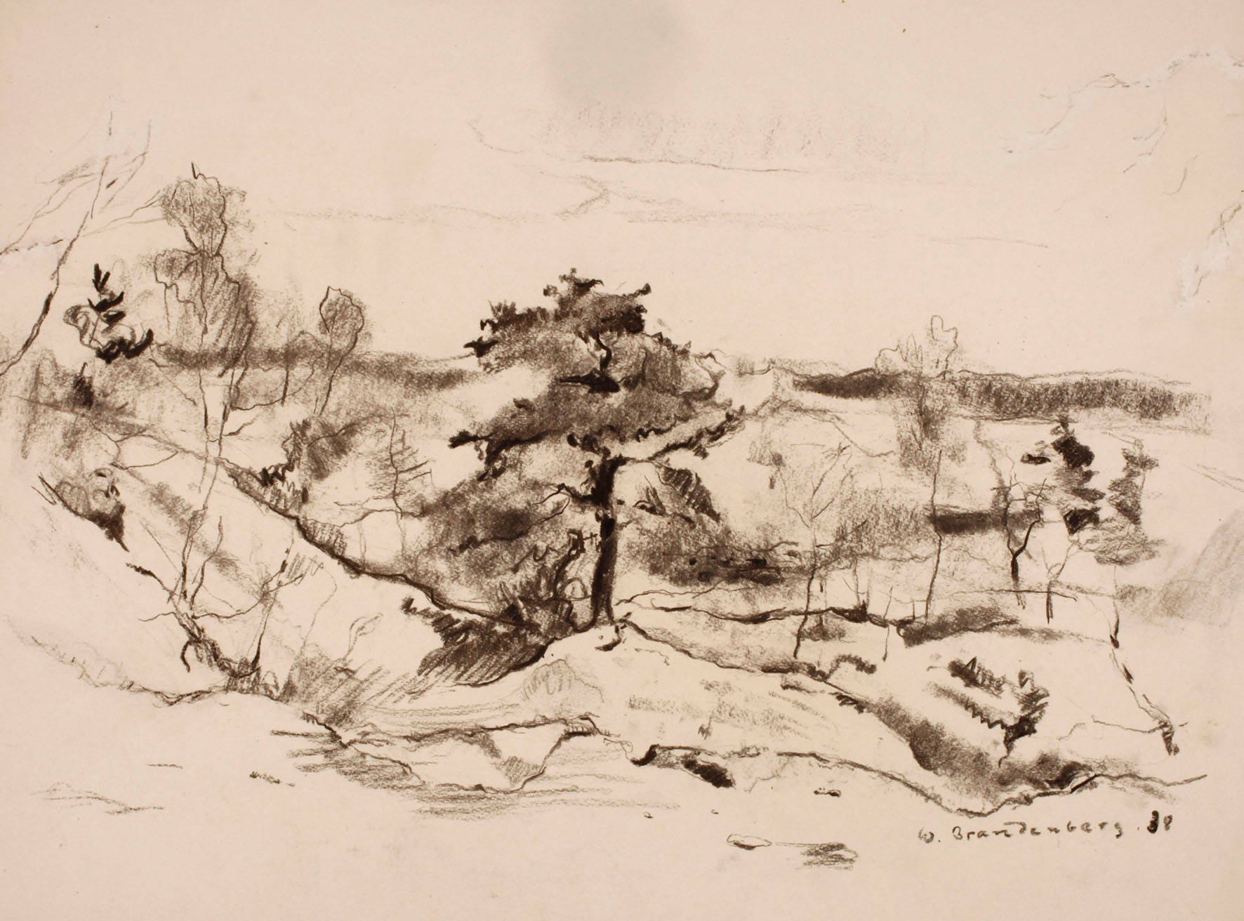 Blick in sanft bewegtes Hügelland mit einzelnen Bäumen, 1938 beschickte Brandenberg die Große Deutsche Kunstausstellung im Haus der Deutschen Kunst München mit dem später von Otto Meissner (1880-1953) erworbenem Gemälde ”Am Sandberg”, das wie in vorliegender Zeichnung an zentraler Stelle eine markante Kiefer auf kleiner Anhöhe, als Fixpunkt der Landschaftskomposition zeigt, unsere ebenfalls 1938 entstandene Kohlezeichnung dürfte somit eine Vorstudie zum späteren Gemälde sein, der in seiner Malerei Caspar David Friedrich, Max Liebermann und Adolph Menzel nahestehende Künstler huldigt in seinem Lebenswerk dem Unscheinbaren in der Natur, welche er in seinen mystisch-geheimnisvollen Gemälden oft mit einem melancholischen, lyrischen Unterton fixiert, in seinen atmosphärischen Zeichnungen gelingt es dem Künstler, wie im vorliegenden Blatt, mit wenigen Strichen meisterhaft den Stimmungsgehalt seines Sujets einzufangen, rechts unten signiert und datiert ”W. Brandenberg 38”, rückseitig bezeichnet und betitelt ”Sk16 - Am Sandberg”, geringe Atelierspuren und originale Retuschen, ungerahmt, Blattmaße ca. 38 x 50 cm. Künstlerinfo: eigentlich Ludger Wilhelm Brandenberg, dt. Maler und Zeichner (1889 Essen bis 1975 Krefeld), Vertreter eines neusachlichen Impressionismus, 1892-1906 Kindheit in Krefeld, studierte 1908-13 und 1919-21 an der Akademie Düsseldorf bei Willy Spatz, Ludwig Paul Wilhelm Keller, Julius Paul Junghanns, Adolf Maennchen und Meisterschüler von Adolf Münzer, 1914-18 Kriegsdienst als Offizier im 1. Weltkrieg, unternahm Studienreisen nach Frankreich, Italien, der Schweiz und ins Elsaß, ab 1922 in Krefeld ansässig, ab 1934-44 Lehrer an der Meisterschule des Deutschen Handwerks (Folkwangschule) in Essen, beschickte 1938-44 die Große Deutsche Kunstausstellung im Haus der Deutschen Kunst München, 1913-75 Mitglied im Düsseldorfer Künstlerverein Malkasten und Mitglied der ”Gruppe 47”, tätig in Krefeld, Quelle: Vollmer, Dressler, Bruckmann ”Lexikon der Düsseldorfer Malerschule”, Saur ”Bio-Bibliographisches Künstlerlexikon” und Info Museum Burg Linn.