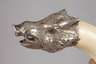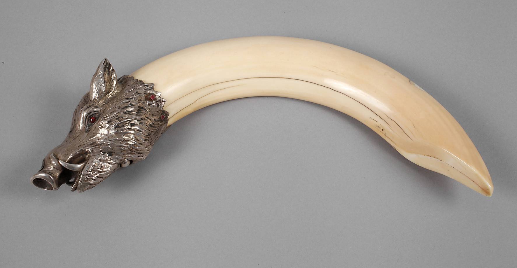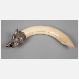 wohl Wien, um 1920, Silber gestempelt 900 sowie punziert GAO, Silbermontierung in Form eines Eberhaupts mit eingesetzten Augen sowie prachtvollem Keilerzahn, dieser alt rep., L 26,5 cm.