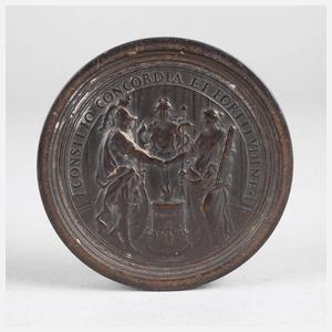 Großbritannien/Niederlande, Avers) Versammlung der Olympier, Umschrift ”INGENTES ANIMO. DIGNAS IOVE CONCIPIT IRAS CONCILIUMQVE VOCAT”, im Abschnitt ”CONVENTUS FOEDERAT. PRINCIP. PRAESIDE GUILIELMO III. R. BRIT. HAGAE COMIT. CELEBR. 1691. P. H. M.”, Revers) drei Götter an einem Altar, der die Volkswohlfahrt propagiert, Umschrift ”CONSILIO CONCORDIA ET FORTITVDINE”, Holz, D Medaillons ca. 45 mm, D ges. ca. 56 mm, H ca. 13 mm.
