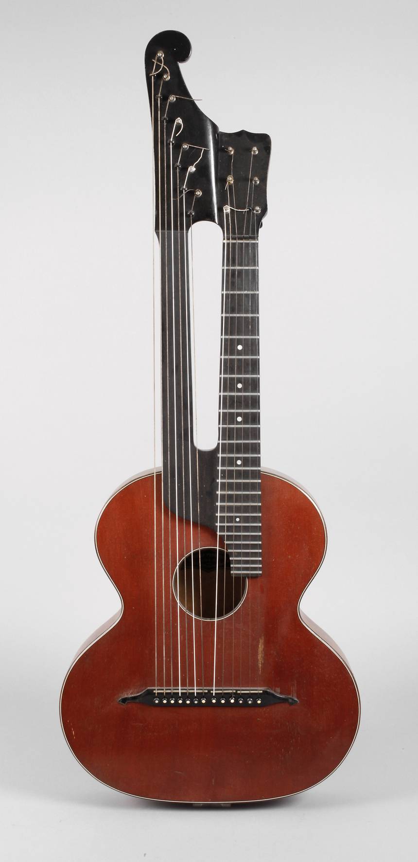 Anfang 20. Jh., mit Klebezettel Josef Perneger Linz a.D., Korpus aus Vogelaugenahorn, Decke aus Resonanzfichte, ebonisierter Doppelhals mit 13 Saiten, Decke mit Rissbildung, Alters- und Gebrauchsspuren, L 106 cm.