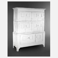um 1900, Nadelholz mit späterer weißer Fassung, drei übereinander gesetzte Segmente, das obere leicht konisch, seitlich mit klappbaren Griffen aus Gusseisen, Türen mit asymmetrisch angeordneten Kassetten, originale Messingbeschläge, rest.bed., Maße 200 x 160 x 61 cm.
