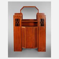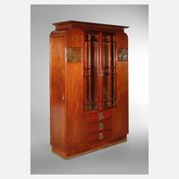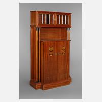 Entwurf 1914, innen Herstellerplakette Kunstmöbelfabrik Otto Pach in Wien, Kirschbaum auf Eiche furniert, gebauchtes Unterteil mit zwei Türen und breitem Schubkasten, darüber ausziehbare Platte mit kleinem Messingbeschlag, seitlich von zwei Säulen umfasst, bogenförmiger Aufsatz mit feiner floraler Schnitzerei aus Lindenholz, rückseitig Inventarnummer in Tusche Nr. 2182, guter unrestaurierter Originalzustand, ein Einlegeboden ergänzt, mit Schlüssel, Maße 206 x 130 x 51 cm. Literatur vergl.: Ausstellungskatalog Museum Künstlerkolonie Darmstadt, Abbildung S. 160.