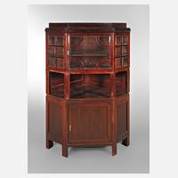 um 1905, innen gemarkt ”Vereinigte Werkstätten für Kunstgewerbe, Raumkunst Dresden, Victoriastraße 3-7”, Mahagoni massiv und teilweise furniert, fünfeckiger Korpus mit dreiseitig verglastem, abnehmbarem Oberteil, mit facettgeschliffenen Scheiben und furnierten Einlegeböden, Oberfläche rest.bed., Maße 134 x 75 x 75 cm.