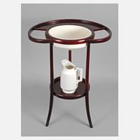 um 1900, Tischunterseite mit Klebeetikett Jacob & Josef Kohn Wien, Buchenbugholz und Schichtholz auf Mahagoni gebeizt, seitlich Handtuchhalter, dahinter Ablage für Seife etc., mit originaler Waschschüssel und Kanne aus cremefarben glasiertem Steingut, wohnfertig restauriert, Maße 80 x 69 x 58 cm.