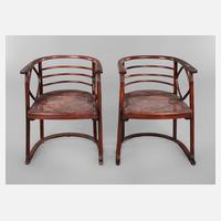 um 1915, Variante nach einem Entwurf von Josef Hoffmann, Zarge mit Brandstempel J & J Kohn, Buche und Schichtholz auf Mahagoni gebeizt, bequeme Armlehnsessel mit umlaufender Lehne, schwarzes Lederpolster (erneuert), rückseitig mit dekorativen großen Messingziernägeln, wohnfertig restauriert, Maße 79 x 62 x 76 cm.