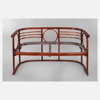 um 1910, ungemarkt, Buchenbugholz rotbraun gebeizt, Sitzfläche und Rückenpolster fehlen, rest.bed., Maße 85 cm, SH 46 cm.