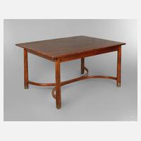 Platte mit Klebeetikett Jacob & Josef Kohn Wien, um 1905, mahagonifurniert, große einteilige, rechteckige Platte, getragen von flacher Zarge auf vier Rundfüßen mit Messingmanschetten, verbunden durch bogenförmige Verstrebung, die Stirnseiten ausziehbar, mit automatisch ausklappbaren Hilfsbeinen, zwei separate Platten zum Einlegen vorhanden, diese ebenfalls in Mahagoni furniert, Alters- und Gebrauchsspuren, Plattenrand mit kleinen Furnierfehlstellen, Platte lose, rest.bed., Maße 76 x 110 x 140 cm, L max. 250 cm.