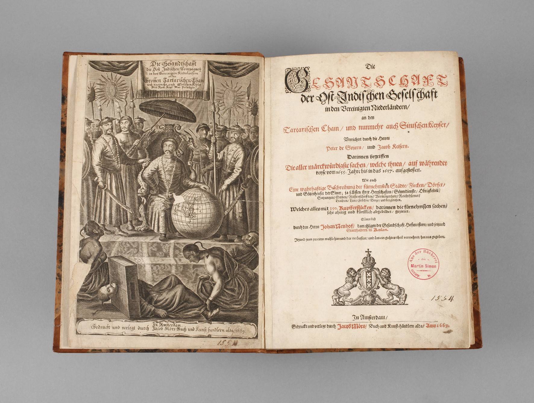 in den Vereinigten Niederländern, an den Tartarischen Cham, und nunmehr auch Sinischen Keyser, verrichtet durch die Herren Peter de Gojern, und Jacob Keisern, darinnen begriffen die aller märckwürdigste sachen, welche ihnen, auf währender reyse vom 1655. Jahre bis in das 1657. aufgestoßen, wie auch eine wahrhaftige Beschreibung der fürnehmsten Städte, Flecken, Dörfer, und Götzenheuser der Siner, ja selbsten ihrer Herrschaften, Götzendienste, Obrigkeiten, Satzungen, Sitten, Wissenschaften, Vermögenheit, Reichthümer, Trachten, Tiere, Früchte, Berge und dergleichen, welches alles mit 150. Kupfferstücken, darinnen die fürnehmsten sachen, sehr ahrtig und künstlich abgebildet, gezieret [...], 2. Aufl. Amsterdam bei Mörs 1669, Format Lex. 8°, 420 S. und 6 Blatt Register, zahlreiche topographische, teils großformatige Kupfer (Doppelseiten), ethnographische sowie botanisch-zoologische Kupfer über China (auf S. 347 das Dürer-Nashorn rezipiert), Titelkupfer alt restauriert mit Fehlstellen, wenige Seiten am Rand alt stabilisiert/Risse hinterlegt, S. 33/34 mit restauriertem Riss, Seiten und Kupfer zwischen S. 46 und 51 im oberen Randbereich alt geflickt, S. 163 mit wenigen Anstreichungen, Ränder mäßig fleckig, sonst altersgemäß sehr schöner Zustand mit normalen Gebrauchsspuren, schon vor längerer Zeit neu in Halbleder gebunden.