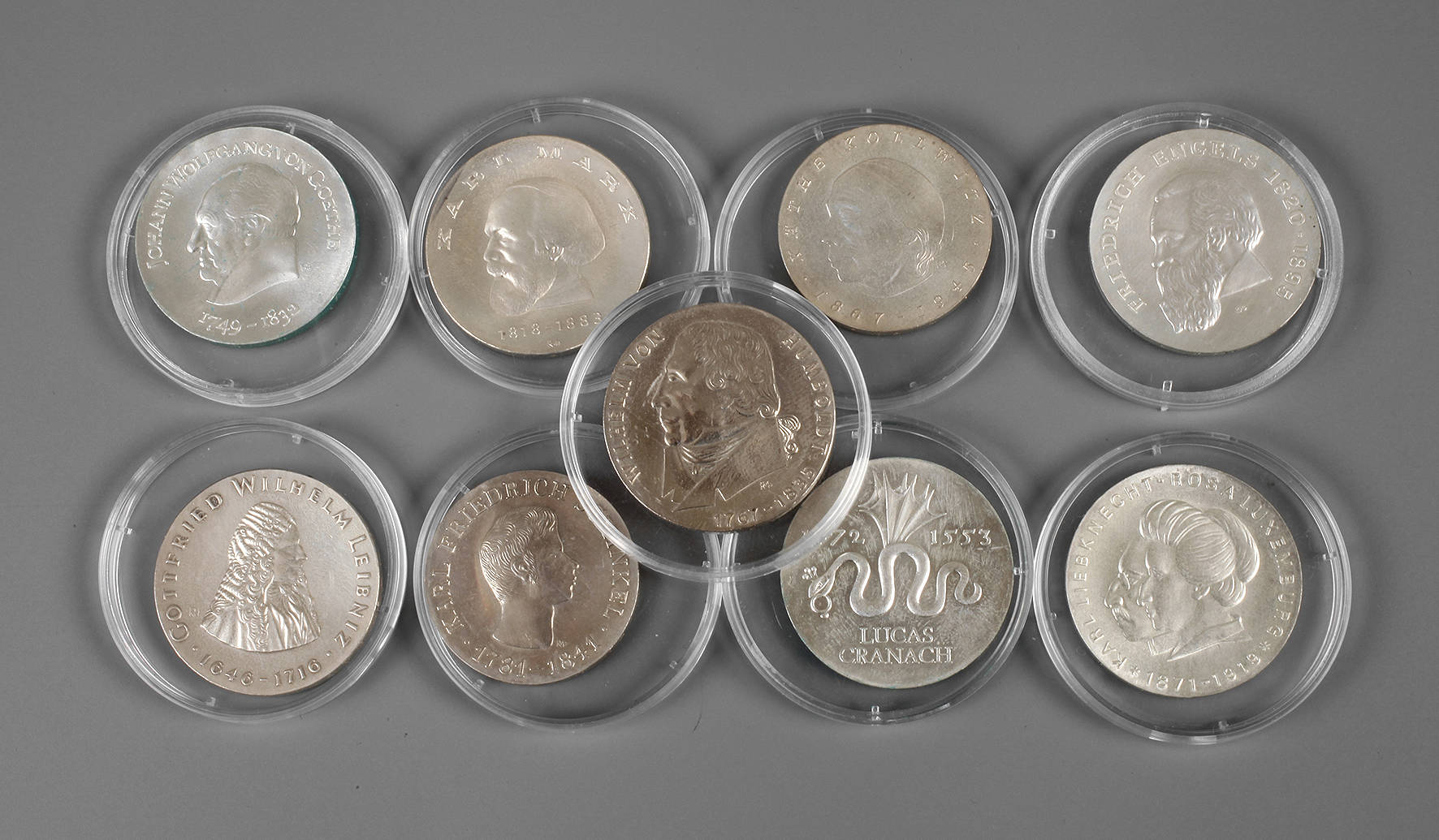 1: 20 Mark Goethe 1969, – 2: 20 Mark Humboldt 1967, – 3: 20 Mark Cranach 1972, – 4: 20 Mark Leibniz 1966, – 5: 20 Mark Liebknecht/Luxemburg 1971, – 6: 20 Mark Engels 1970, – 7: 20 Mark Marx 1968, – 8: 10 Mark Schinkel 1966, – 9: 10 Mark Kollwitz 1967, vz/stgl.
