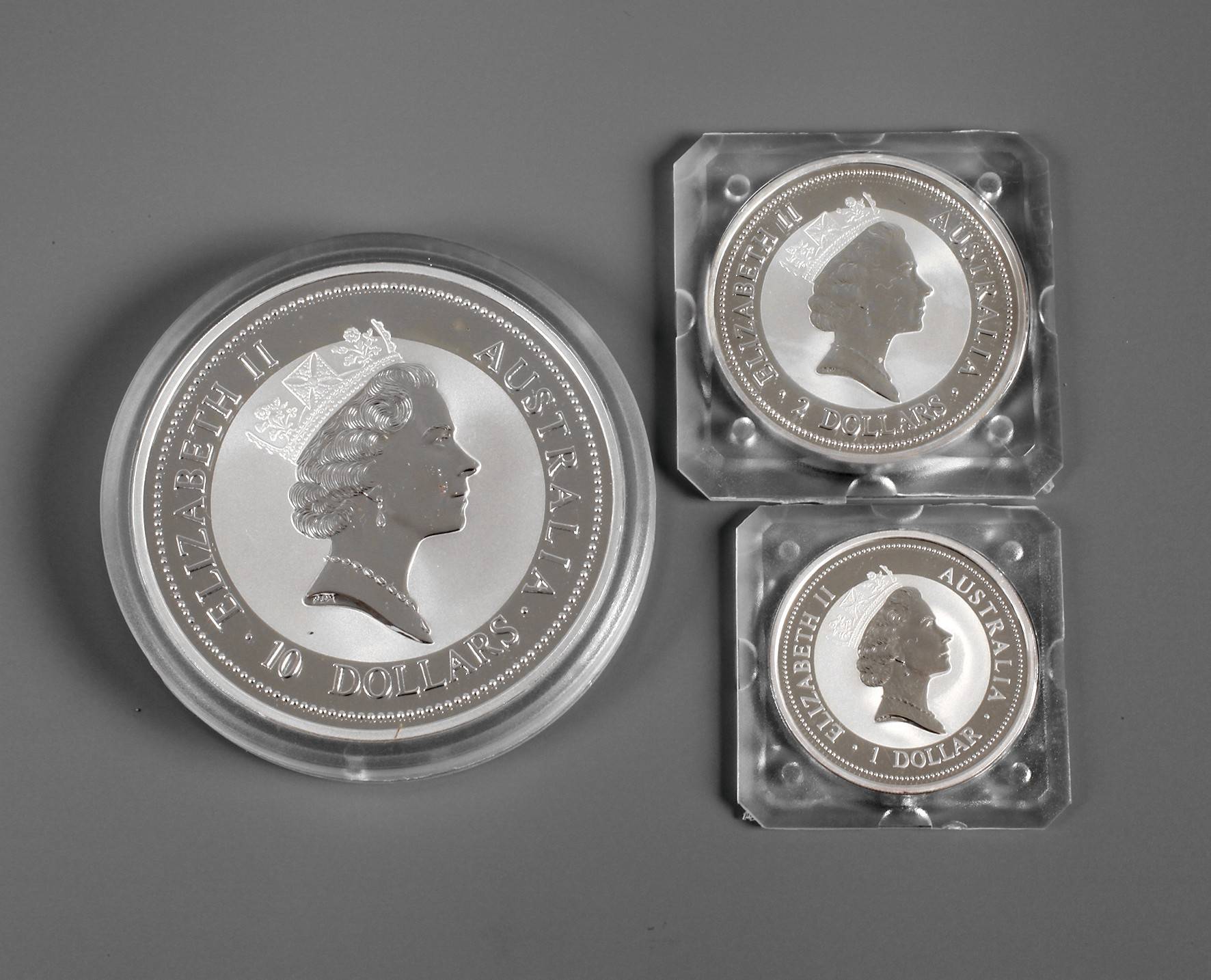 1, 2 und 10 Dollar-Prägungen 1998, jeweils 999er Silber, Stgl. in Originalkapseln, G ges. ca. 404 g.
