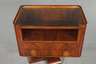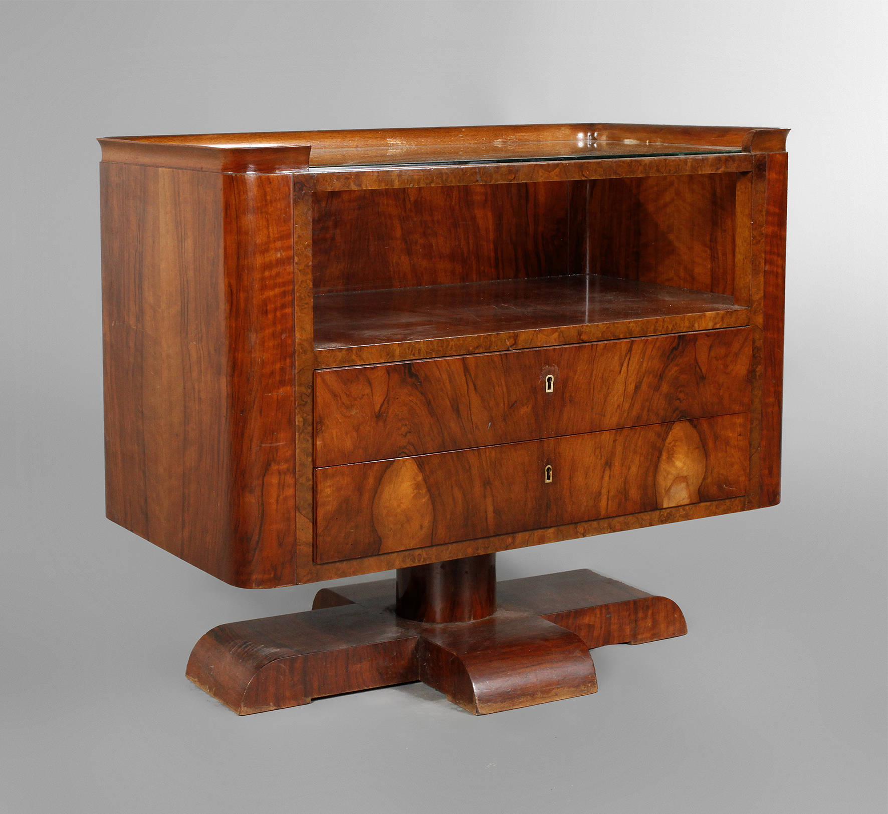 1930er Jahre, nussbaummaserfurniert, drehbar gelagert, mit Glasplatte und zwei Schüben, Altersspuren, Maße 64 x 74 x 43 cm.
