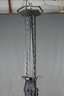 Frankreich, 1920er Jahre, Gestell aus Schmiedeeisen, geschwärzt, durchbrochen gearbeitet und mit plastischen Blatt- und Blütenmotiven verziert, drei eingelegte, satinierte und im Rippenmodel formgeblasene Klarglasschirme, H 80 cm, D 60 cm.