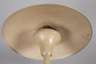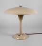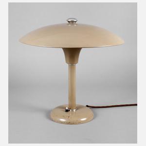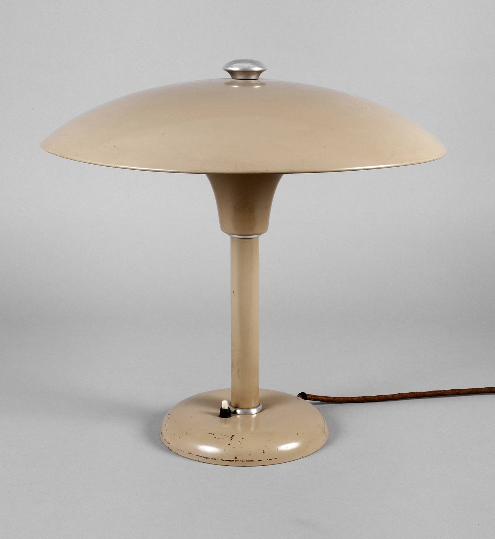 1930er Jahre, am Boden gemarkt MSW Schröder Lobenstein, cremefarben gefasstes Metallgehäuse mit ausladendem Kuppelschirm, einflammig elektrifiziert, Alters- und Gebrauchsspuren, H ca. 40 cm.