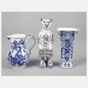 2. Hälfte 19. Jh., Fayence mit Scharffeuerfarben bemalt, Henkelkrüglein Holland mit Windmühlenmotiv am Wasser, Henkel geklebt, kleine sechseckige Kelchvase mit Malername Duijn, geklebter Ausbruch, dazu eine singende Katze mit Notenheft, bezeichnet Zeus 18761 France, ein Bein geklebt und ein Auge fehlend, H max. 15 cm.