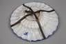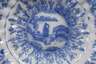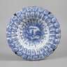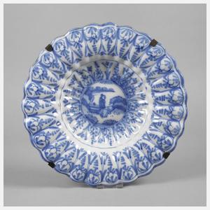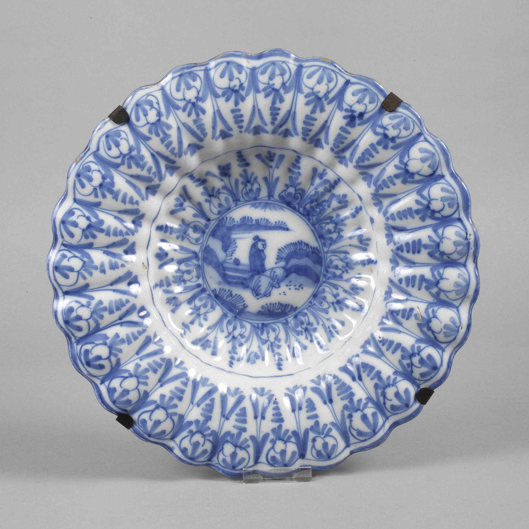 18. Jh., unter der Fahne ein gepinseltes Zeichen, leicht gelblicher Fayencescherben, weiß glasiert und reich mit kobaltblauer Scharffeuerfarbe bemalt, auf dem gewölbten Spiegel eine chinesische Figur in Landschaft, umgeben von floralen Bandmotiven, spätere Wandaufhängung aus Messing, minimale Glasurabplatzer, insgesamt sehr schöner altersgemäßer Zustand, D 34,5 cm.