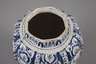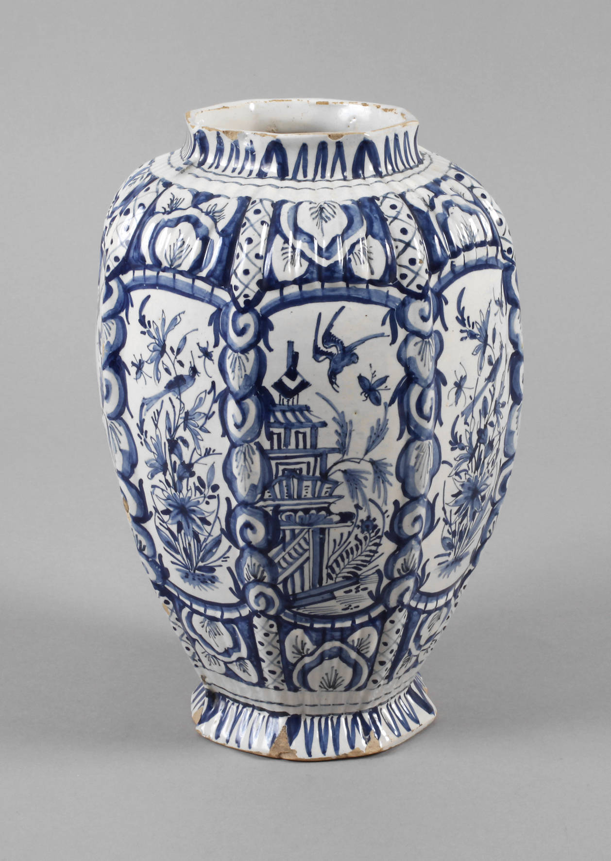Frankfurt/Main, 1666–1772, Zahlenmarke 7, leicht rötlicher Fayencescherben, weißlich glasiert und reich mit kobaltblauer Scharffeuerfarbe bemalt, japonisierende Gebäude und Blumenranken in reliefierten Kartuschen, Gitterdekor und Ornamentbänder, Vögel und Insektenmalerei, Abplatzer an Stand und Mündung, H 26 cm.