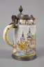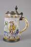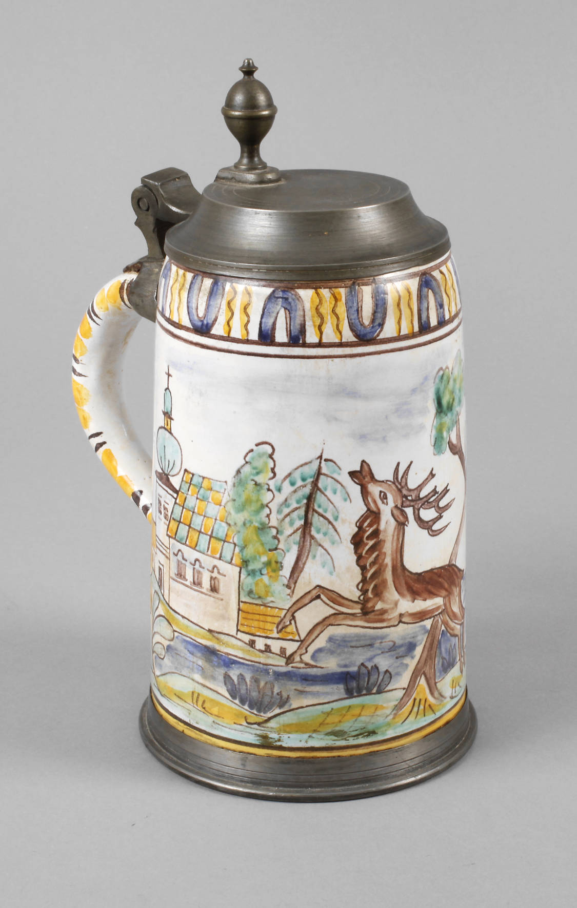 19./20. Jh., ziegelroter Scherben weißlich glasiert, mit bunten Scharffeuerfarben bemalt, jagdlich mit Jäger, Hirsch und Kirche in Landschaft, Zinnstandring und Zinndeckel, guter Zustand, H 24 cm.