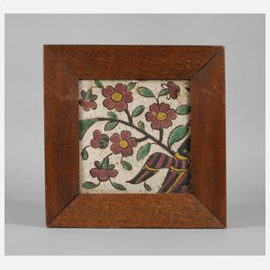 18. Jh. massiver Fayencescherben mit weißlich-grüner Craqueléglasur, mit bunten Farben gemalter Blütenzweig, in späterer Eichenleiste gerahmt, vom Brand etwas blasig und zwei Ausbrüche am Rand, IM 20 x 20 cm, ges. 32 x 32 cm.
