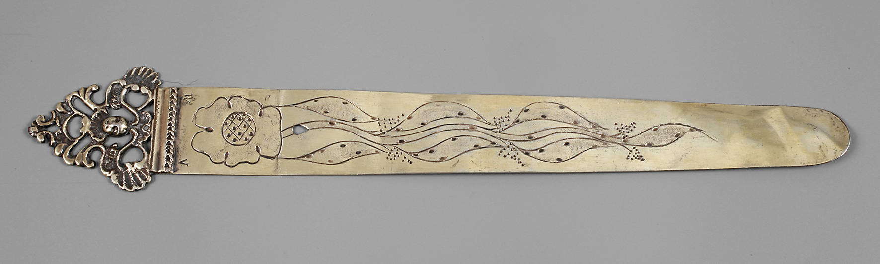 wohl um 1680, gepunzt WV, Silber vergoldet, schauseitig floral graviert und fein ziseliert, die Handhabe als Engelskopf, geknickt und gedellt, L 21,5 cm, G ca. 22 g.