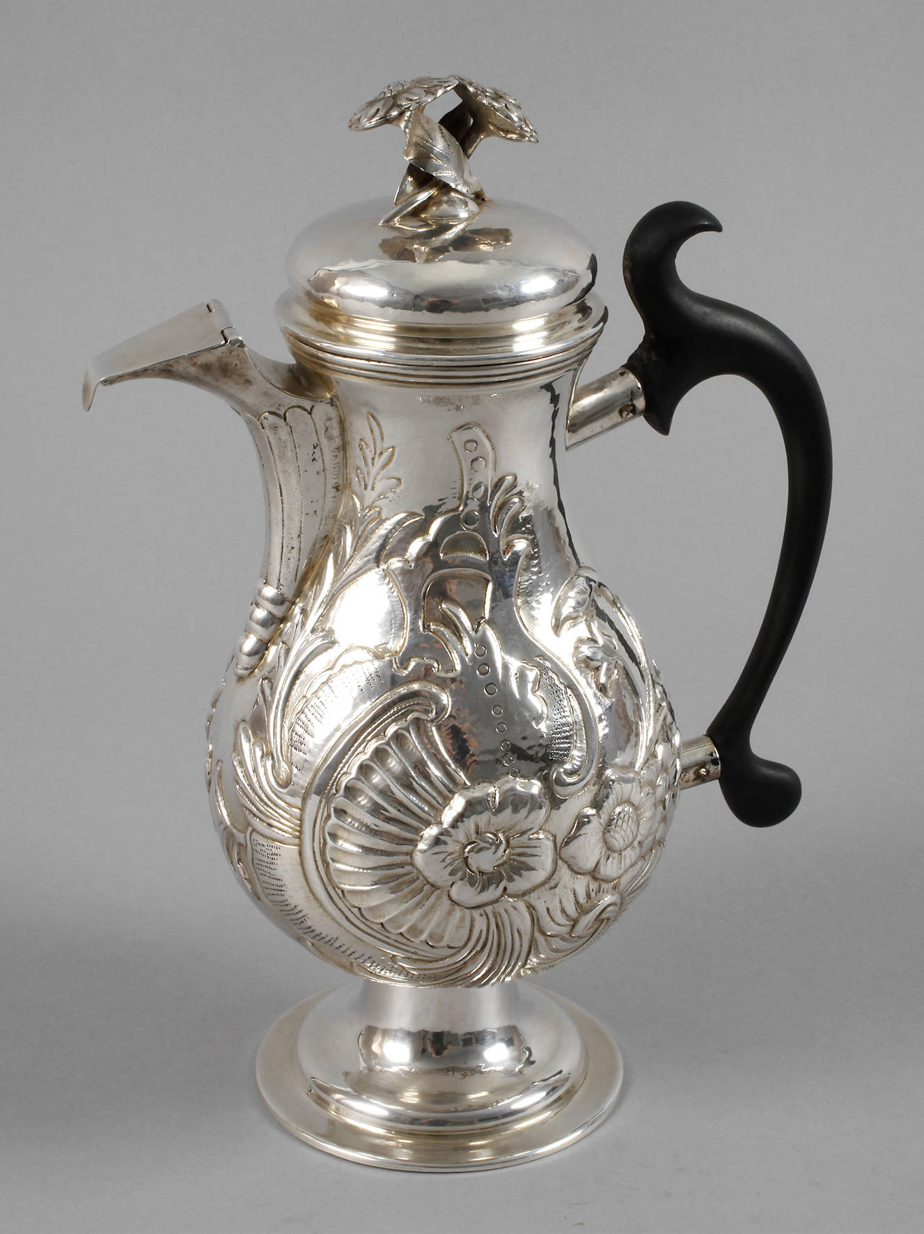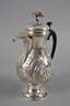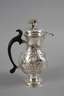 wohl 2. Hälfte 18. Jh., im Boden zwei unleserliche Punzen, fein getrieben und graviert, bauchiger Korpus mit Rocaillen und Blüten verziert, Ausguss mit scharniertem Klappdeckel, H 27 cm, G ca. 656 g.