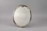 um 1900, Silber geprüft, massive schwarz lackierte Holzplatte mit Klappständer, originales, facettgeschliffenes Spiegelglas, ovale Form, graviertes Besitzermonogramm AC ligiert, normale Altersspuren, 47 x 42 cm.