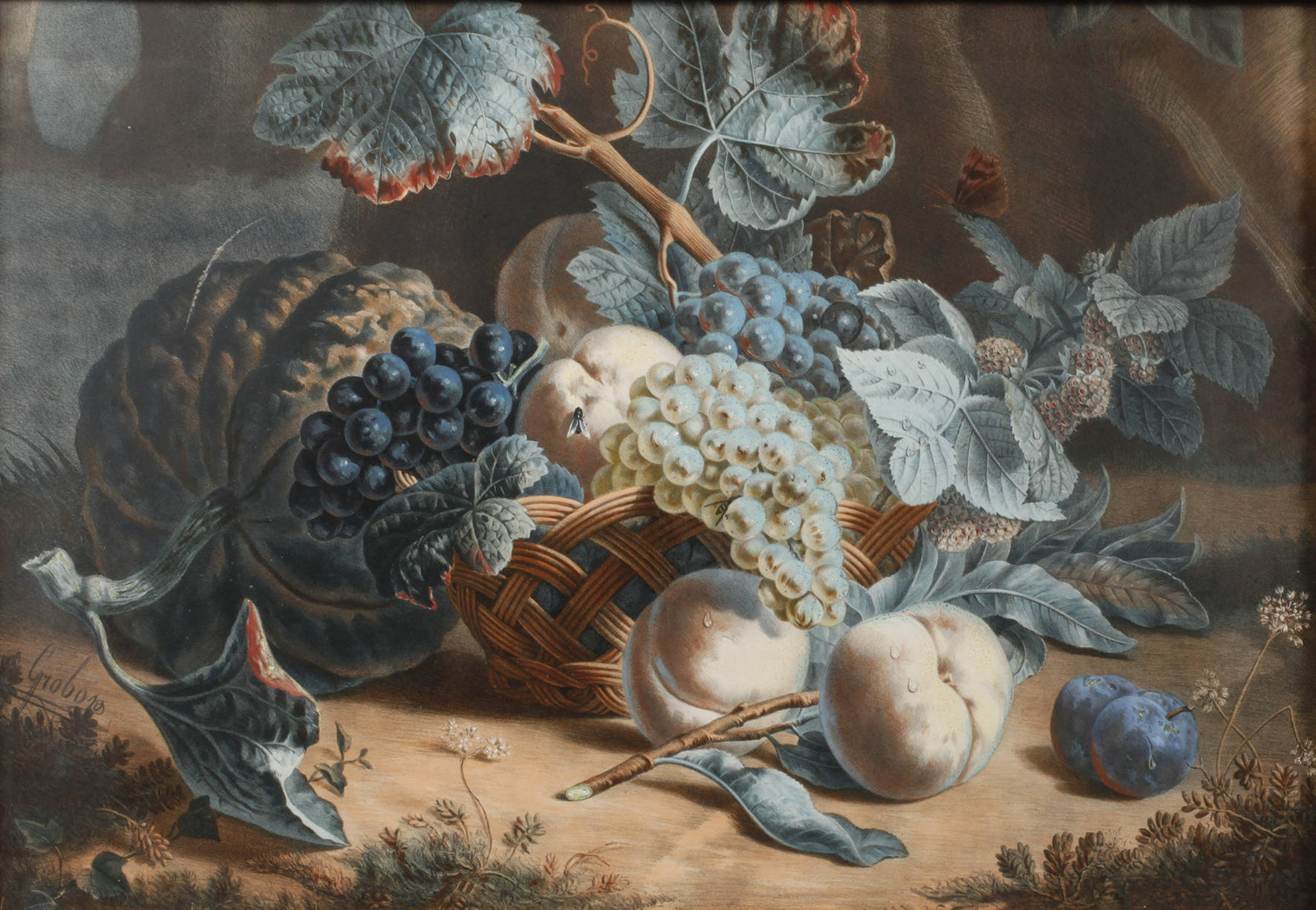 dekoratives Arrangement aus Weintrauben, Pfirsichen und Brombeeren im Weidenkorb, neben Kürbissen und Pflaumen, die Darstellung besticht durch ihre gekonnt erfasste Stofflichkeit und Raumwirkung mit trefflichem Licht, gleichwie die liebevollen Details wie Tautropfen auf dem frischen Obst und naturalistisch erfasste Insekten, seltene handkolorierte Lithographie, um 1850, links unten in der Platte signiert ”Eug. Grobon”, schön hinter Glas in ca. 12 cm breiter Jugendstil-Goldstuckleiste gerahmt, Falzmaße ca. 43,5 x 62,5 cm. Künstlerinfo: eigentlich Anthelme-Eugène Grobon, frz. Maler, Zeichner und Lithograph (1820 Lyon bis 1878 Grigny/Rhône), Bruder und Schüler des Malers, Lithographen, Freskanten und Porzellanmalers Francois-Frédéric Grobon (1815 Lyon bis 1901 oder 1902 Lyon), 1834–35 und 1840–41 weitergebildet an der École des Beaux-Arts (Kunstschule) Lyon bei Jean-Claude Bonnefond und Victor Orsel, veröffentliche 1844–50 in Zusammenarbeit mit seinem Bruder unter der Firmierung ”Gebrüder Grobon” Lithos, unter anderem ein Mappenwerk mit Blumen- und Fruchtstücken in der Art von Pierre-Joseph Redouté (1759 St. Hubert bis 1840 Paris) bzw. im Auftrag der Gesellschaft der Freunde der Künste Lyon nach unveröffentlichten Zeichnungen von Antoine Berjon (1754 Lyon bis 1843 Lyon), beschickte 1846–47 die Kunstausstellungen in Lyon und 1852–70 den Pariser Salon, erhielt diverse Ehrungen, wie 1858 Silbermedaille Dijon und Bronzemedaille in Rouen, tätig in Lyon, Quelle: Thieme-Becker, Saur ”Bio-Bibliographisches Künstlerlexikon”, Bénézit und Internet.
