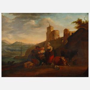 Bauernfamilie, umgeben von ihren Rindern, Schafen, Hund und Ziege, vor der Stadtmauer am Flussufer ruhend, fein lasierende Genremalerei, Öl auf Leinwand, 18. Jh., unsigniert, Craquelure, doubliert, alt repariert, etwas restaurierungsbedürftig, im ca. 8 cm breiten Goldstuckrahmen im Régencestil, Falzmaße ca. 60,5 x 81 cm.