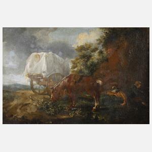 Gras und Kräuter fressendes Pferd vor abgestellten Planwagen sowie zwei von der Reise sich erholende Männer im rechten Bereich, intime, teils mit spitzem Pinsel ausgeführte Malerei, Öl auf Holz, 1. Hälfte 18. Jh., unsigniert, großflächige Retuschen, restaurierungsbedürftig, gerahmt, Falzmaß ca. 15,5 x 23,5 cm.