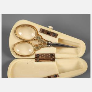19. Jh., ungemarkt, Metall, teils vergoldet und punziert, schlankes Etui aus massivem Elfenbein, L 7,5 cm. BITTE BEACHTEN: VERSAND ERFOLGT NUR INNERHALB DER EU – SHIPPING TO THE 28 EU MEMBER COUNTRIES ONLY!