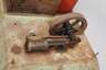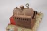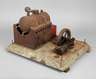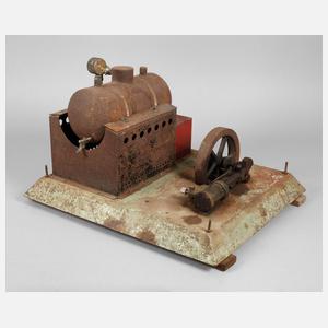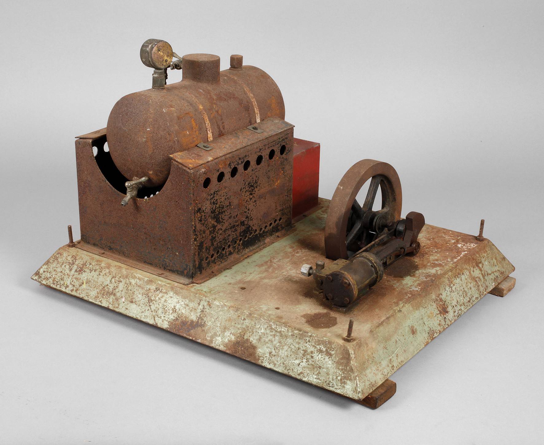ungemarkt, wohl 1930er Jahre, als Lehrmodell oder für den stationären Gebrauch gedacht, liegender Kessel, mit elektrischem Brenner, großes massives Schwungrad, mit liegendem Arbeits- und Steuerungskanister, nicht funktionstüchtig, korrodiert, rest.bed., Maße 40 x 57 x 46 cm.