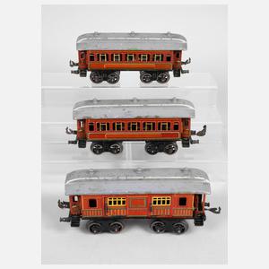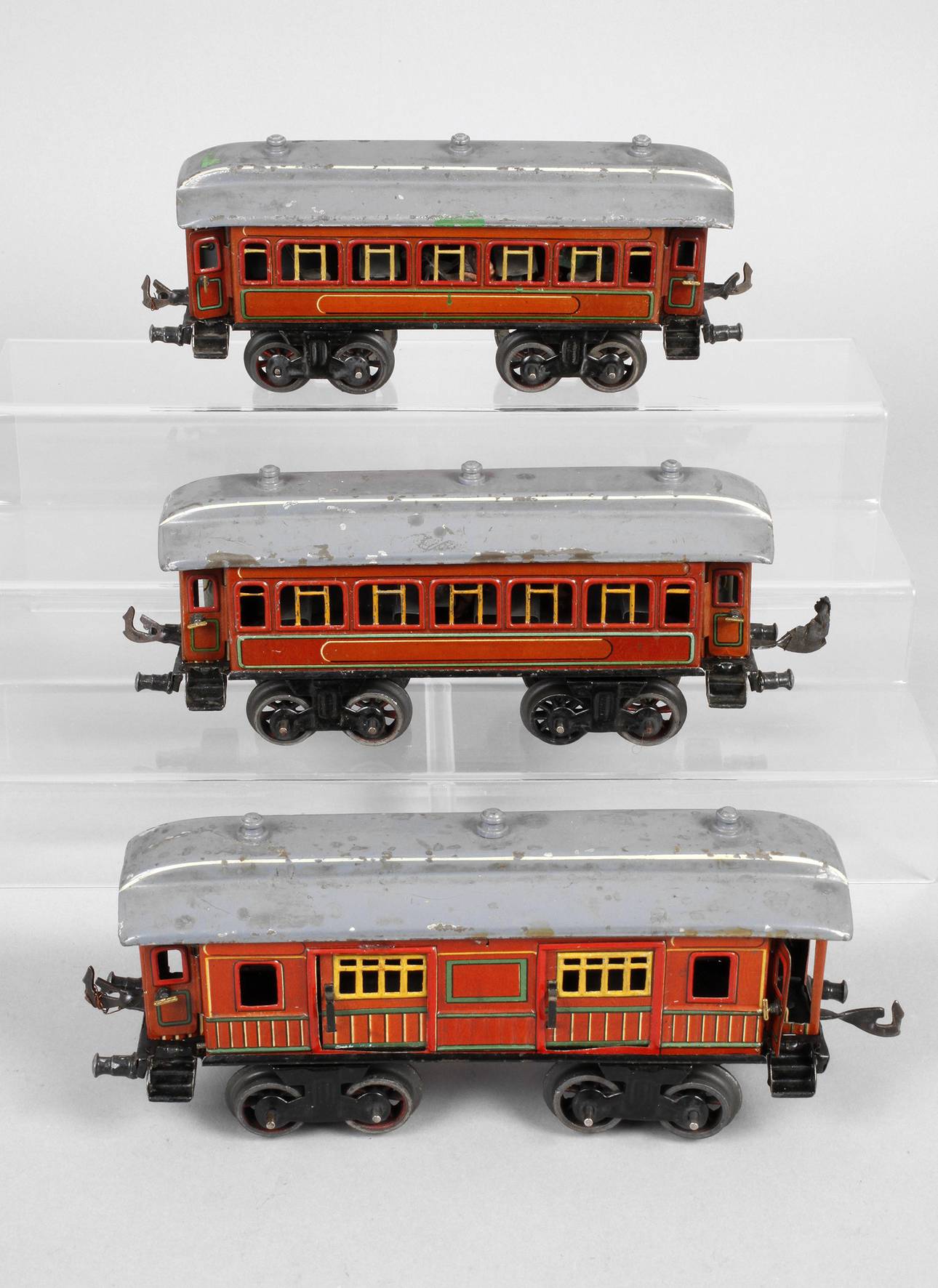 1930er Jahre, Spur 0, vierachsig, alle mit aufklappbarem Dach, Mitropawagen mit drei Personen und Abteilwagen mit zwei Personen, bespielt, Z 2–3, L je 25 cm.