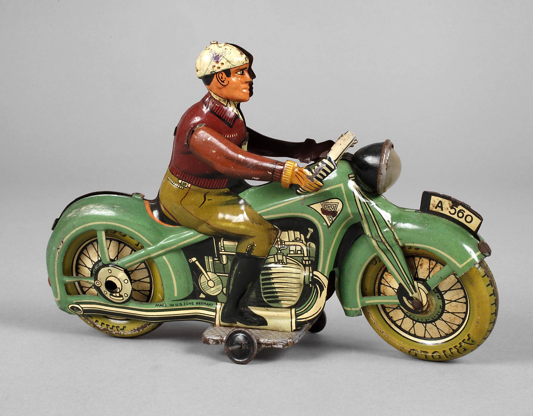 Made in US Zone, 1950er Jahre, Blech farbig lithografiert, funktionstüchtig, ohne Schlüssel, Z 2–3, L 19 cm.