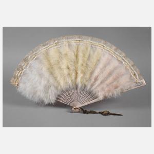 1920er Jahre, rosé gefasstes Holzgestänge, durchbrochen gearbeitet und partiell silberbronziert, Montierung aus Chiffon mit eingefärbtem Federbesatz, Alters- und Gebrauchsspuren, L 60 cm.