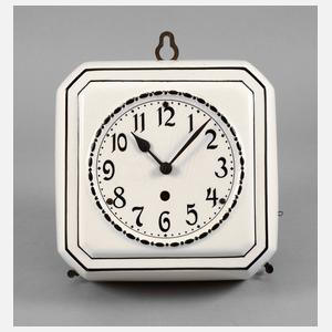 um 1920, quadratische Wanduhr mit schlichtem schwarzen Dekor, Werk gemarkt Gustav Bössenroth, Werk läuft, mit Schlüssel, Pendellinse fehlt, Alterscraquelé, Maße 29 x 29 cm.