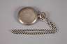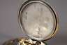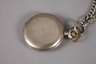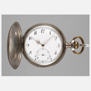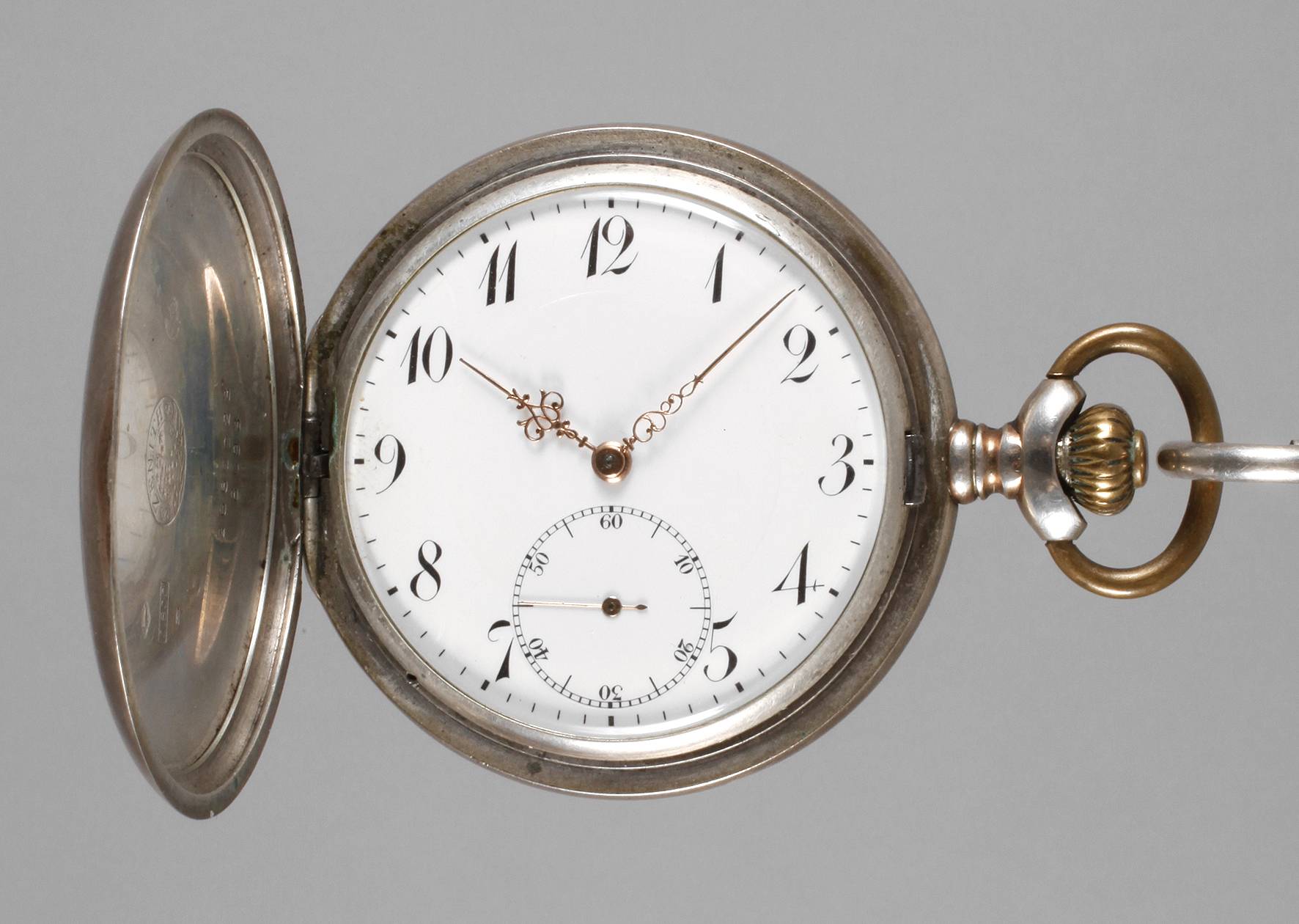 um 1910, Gehäuse und Werk gemarkt, vergoldetes Werk mit Ankergang und Feinregulierung, glattes Silbergehäuse gest. 800, makelloses Emailziffernblatt mit vertiefter Mitte und kleiner Sekunde, Werk läuft, stärkere Tragespuren, an Kette, D 50 mm, Z 2-.