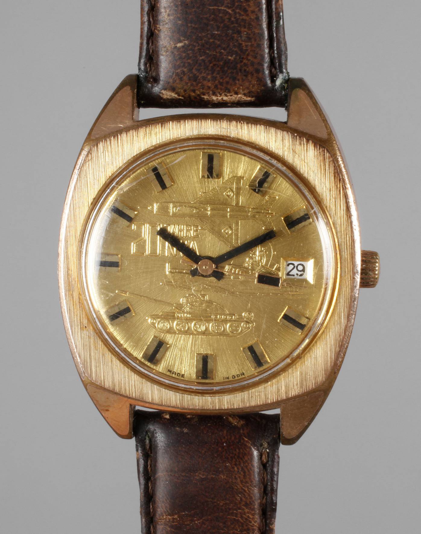 Firma GUB, zum 20-jährigem Bestehen der NVA 1976, vergoldetes Ziffernblatt mit Darstellung der Land-, See und Luftstreitkräfte, Automatikwerk mit Zentralsekunde und Datum, funktionstüchtig, mit Garantieschein und Originaletui, Z 2, D 35 mm.