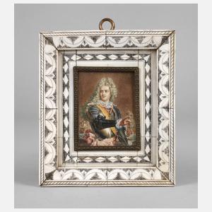Anfang 20. Jh., unsigniert, Gouache auf Elfenbein, qualitätvoll mit spitzem Pinsel festgehaltenes Halbfigurenbildnis eines barocken Regenten im Harnisch, um seinen Hals den Orden vom Goldenen Vlies tragend, mit der Hand auf seine im Hintergrund angedeutete Flotte verweisend, hinter Glas in graviertem Elfenbeinrahmen gefasst, IM 9 x 7 cm. BITTE BEACHTEN: VERSAND ERFOLGT NUR INNERHALB DER EU – SHIPPING TO THE 28 EU MEMBER COUNTRIES ONLY!