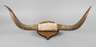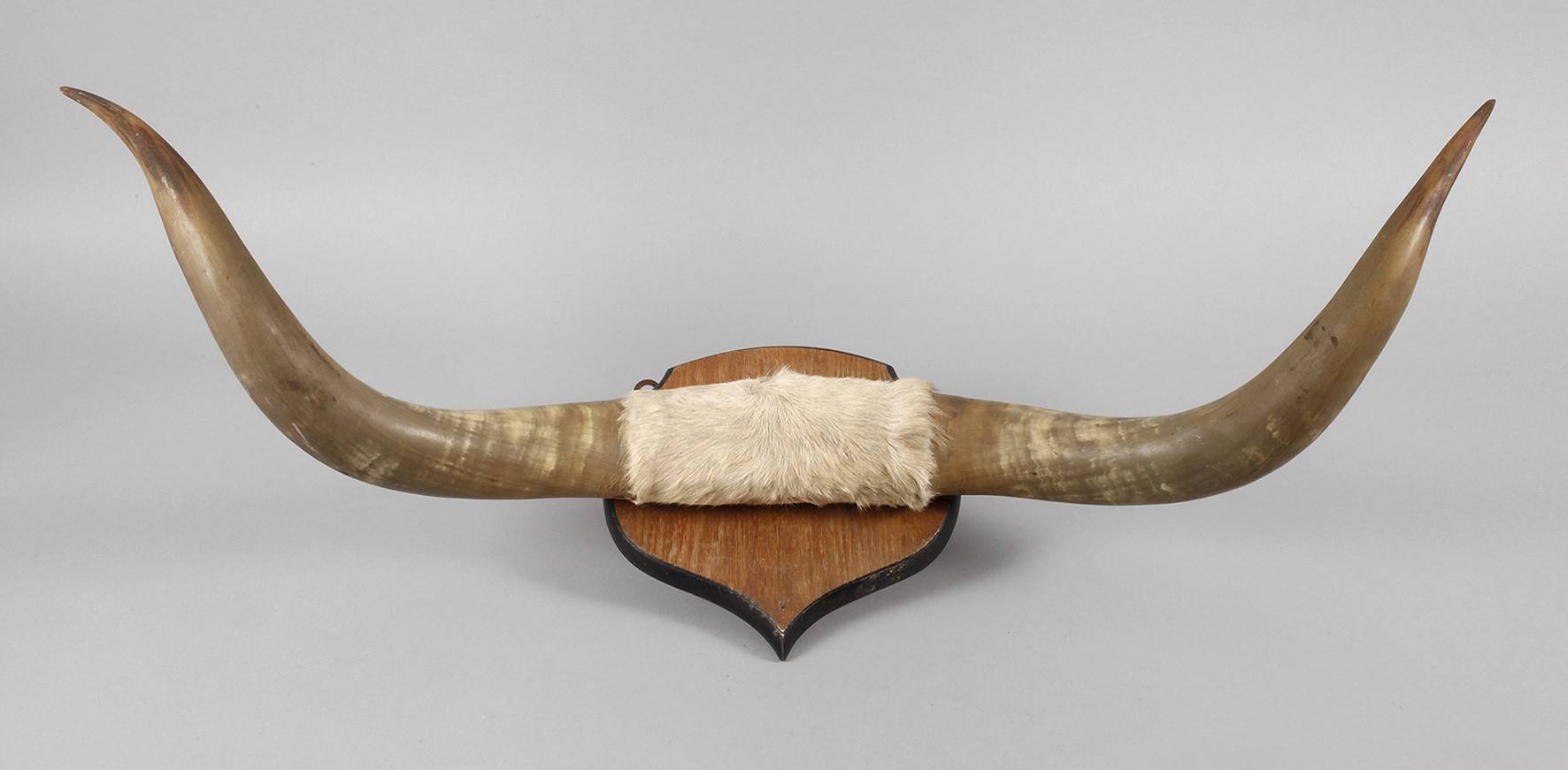 Gehörn eines afrikanischen Watussirindes, auf Eichenholzplatte montiert, mittig mit Fell bezogen, L ca. 120 cm.