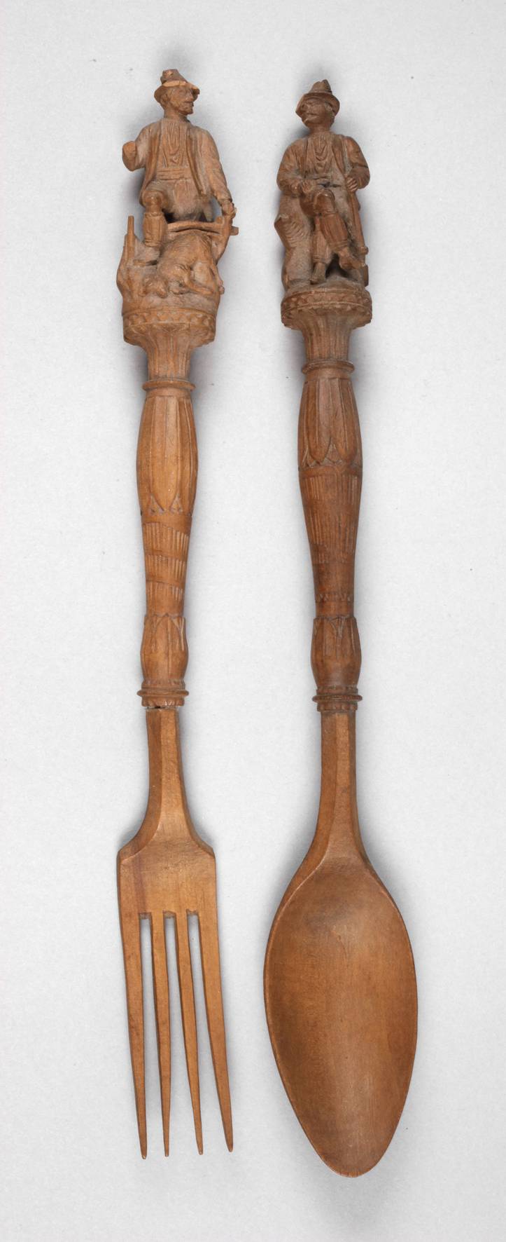 wohl Brienz, 19. Jh., ungemarkt, Löffel und Gabel mit figürlich gearbeiteten Griffstücken in Form vollplastischer Jäger, kleinere Fehlstellen, einer alt geklebt, L je ca. 30 cm.