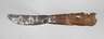 undatiert, hölzerner Messergriff, wohl in Form eines Affen, vermutlich Pavian, der sich um einen Stamm klammert, einfache Eisenklinge mit Figurenpunze, sichtbare Alters- und Gebrauchsspuren, L ca. 17 cm.